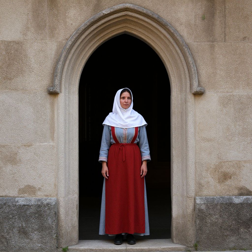 Photograph of a nun standing in a dark, arched doorway of a weathered, beige stone building. She wears a white headscarf, black long-sleeved blouse, and a red apron over a black dress. Her hands are clasped in front of her, and she has a solemn expression. The doorway has a decorative, scalloped arch, and the stone wall shows signs of age with patches of discoloration and a small white stain on the right. The overall texture of the stone is rough and weathered.