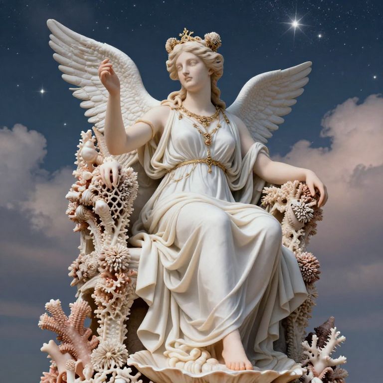 Photograph of a white marble statue depicting a serene, winged goddess with light skin and wavy blonde hair. She wears a flowing white dress with a gold necklace and crown, sitting on a coral-encrusted throne under a starry night sky. Her right hand is raised, and her left arm rests on the throne. The statue's wings are outstretched, and she gazes calmly forward. The background features a deep blue sky with scattered stars and clouds. The coral adds a textured, natural element to the otherwise smooth marble.