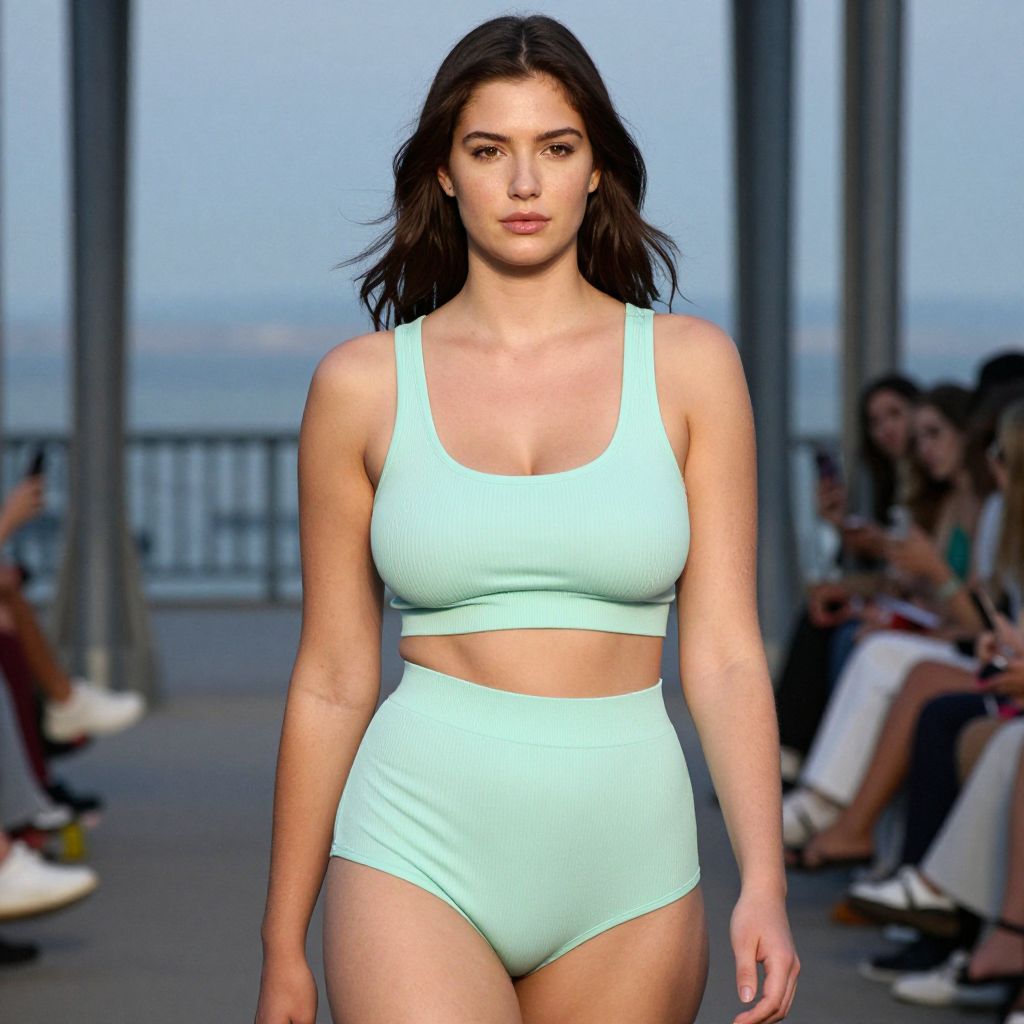 A lanky woman in a minimalist sporty mint green ribbed knit sports bra and matching high-waisted bikini-cut briefs, set against the backdrop of a scenic bridge during a fashion show, captured in the style of anscochrome analog film. Sexy. Pretty face and beаutiful eyes. Big breasts