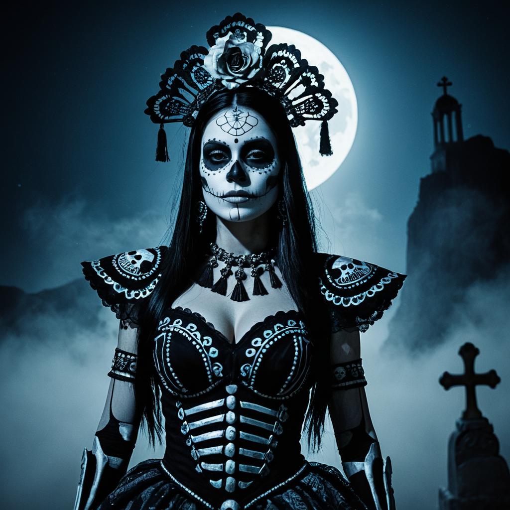 Female shadow priestess in intricate skeletal armor, photo realistic, ultra detailed portrait, luminescent skeletal makeup, la Catrina dia de los muertos, volumetric fog, Hyperrealism, breathtaking, ultra realistic, cinematic lighting, moonlit necropolis
