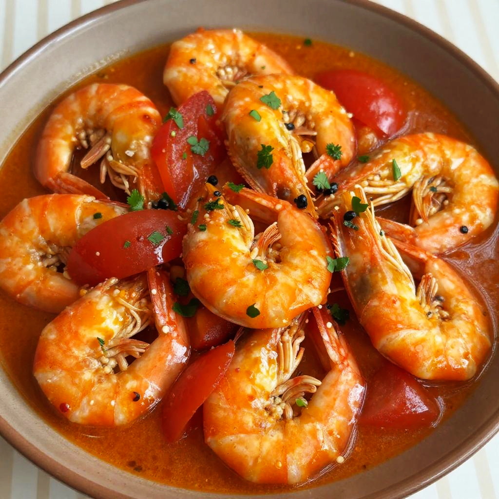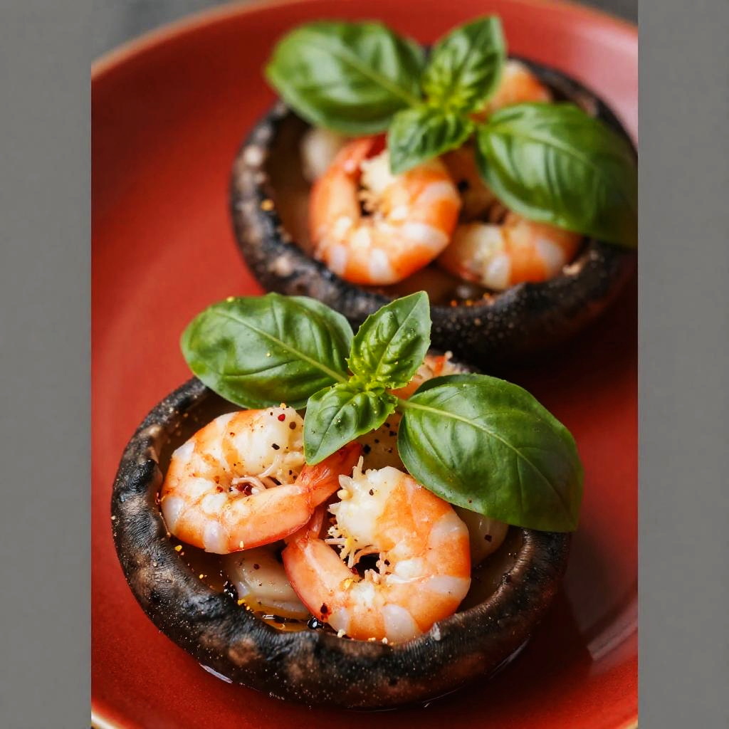 This close-up photo shows two black mushroom caps filled with a mix of orange shrimp, topped with fresh green basil leaves. The shrimp are sprinkled with red pepper flakes. The background is a vivid red, making the colors of the shrimp and basil pop. The image has a slightly blurred gray border on the left and right sides.