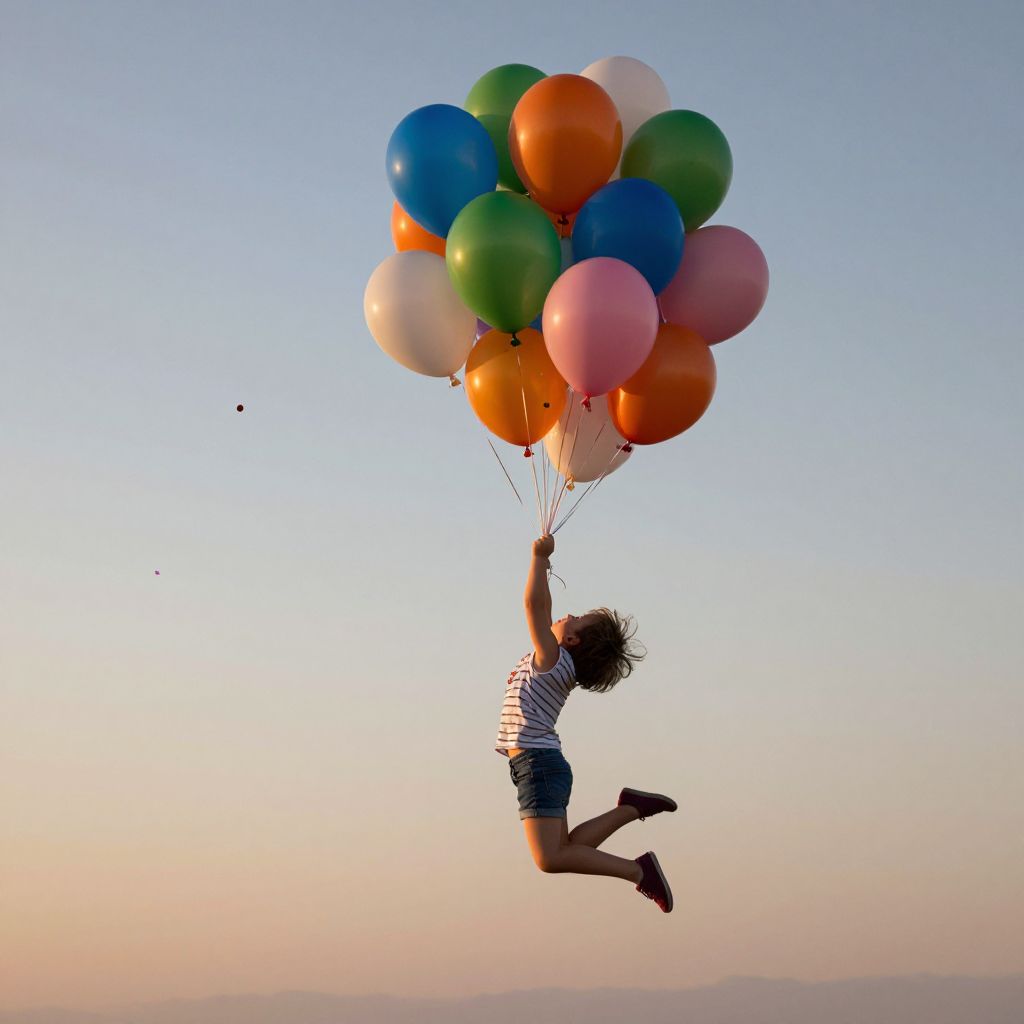 Childhood dreams ascend gracefully, as a cluster of vibrant balloons—blue, green, orange, pink, and white—lift a child skyward amidst a cascade of colorful confetti against a serene twilight backdrop.