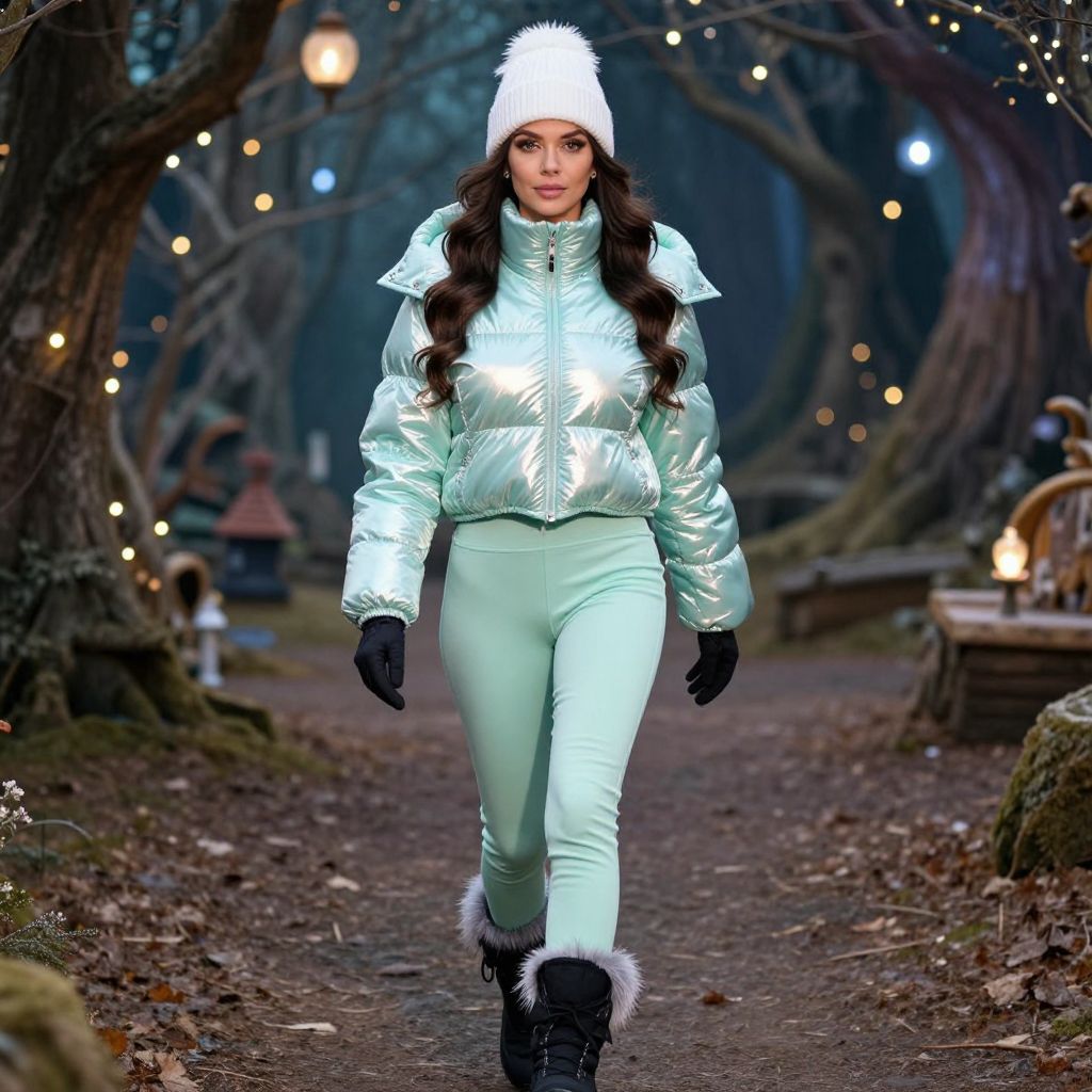 A woman, winter chic, iridescent mint green puffer jacket, high collar, white wool beanie, coordinating mint green skinny pants, fur trim at the cuffs, black snow boots, gloves, walking through a Wonderland forest path with floating lights, cri film style. Sexy. Pretty face and beаutiful eyes. Big breasts