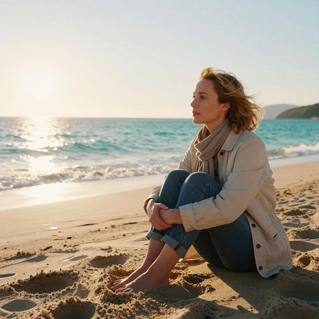 Photograph of a blonde woman in a beige coat and blue jeans sitting barefoot on a sandy beach, gazing at the sunlit ocean.