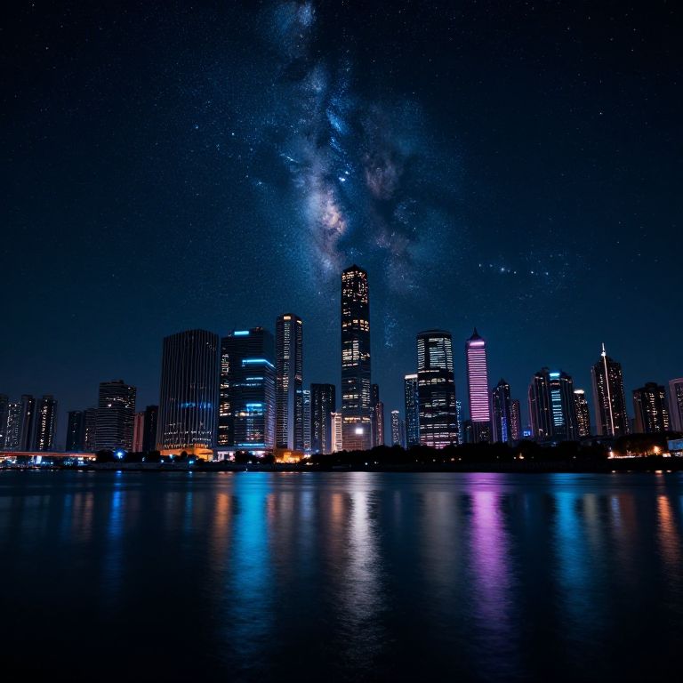 Starry night images free, futuristic city skyline under a spectacular starry night, neon reflections shimmering on river waters, stars twinkling intensely with hints of galaxy clusters, sleek modern architecture contrasting with natural dark sky, cinematic lighting