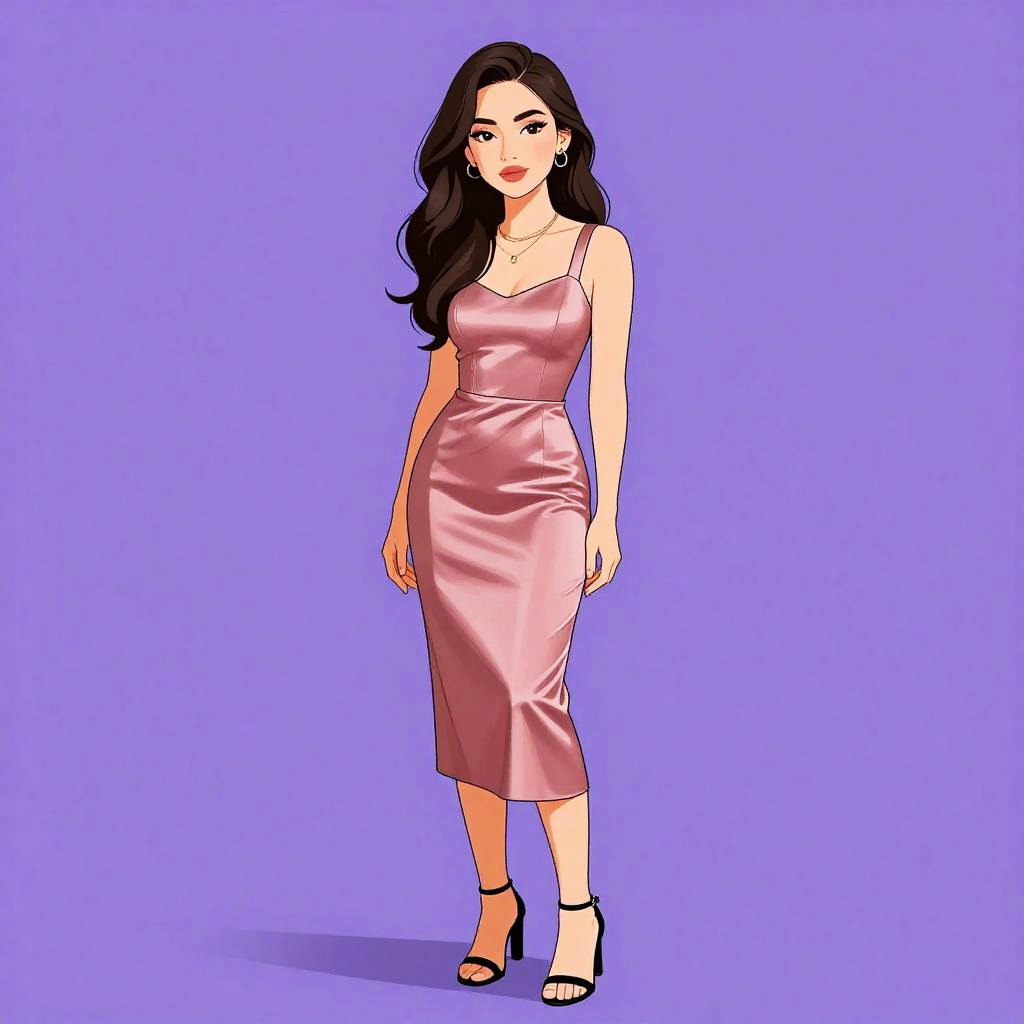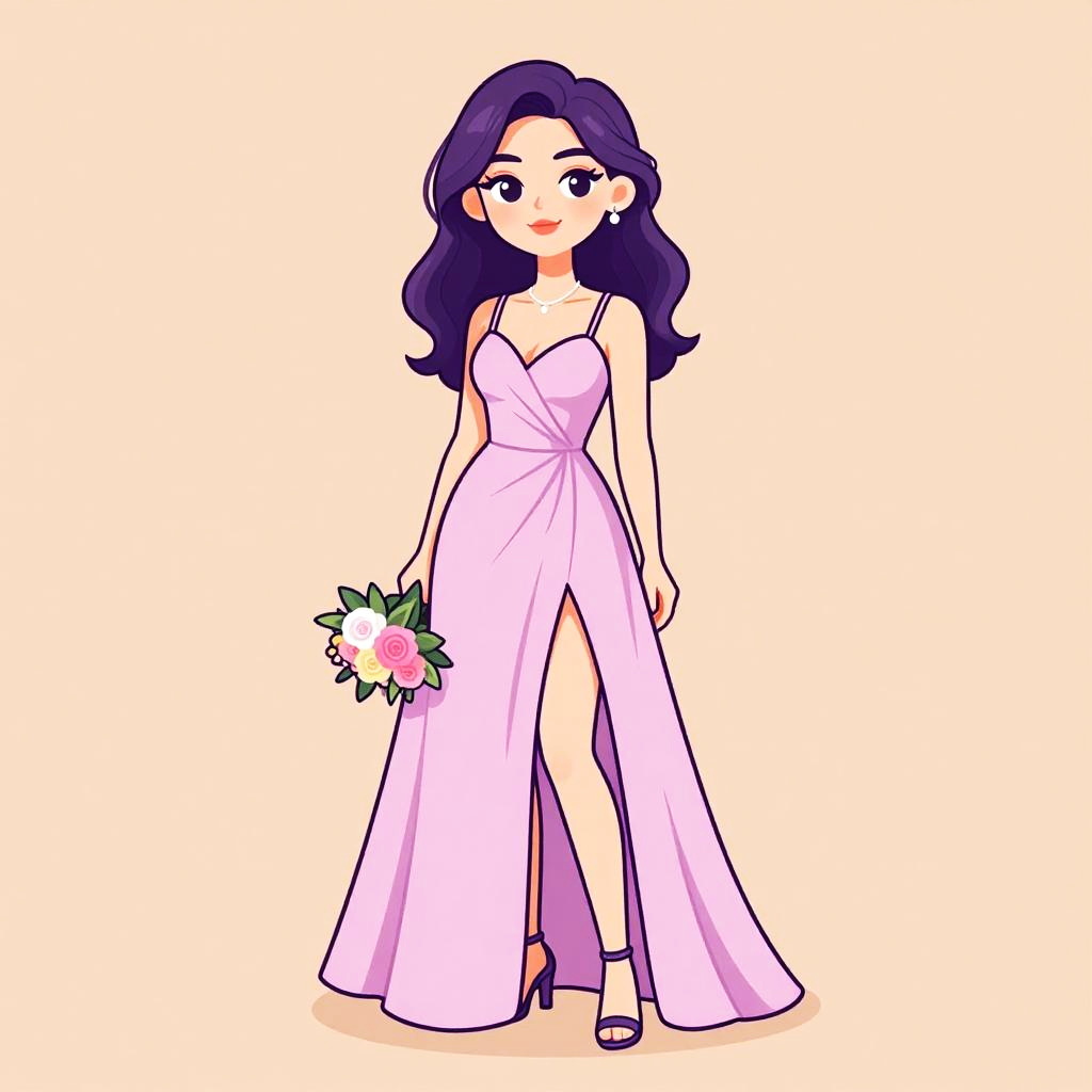 Woman with pretty face and pretty hair. Woman, romantic style, A-line gown in dusty rose, spaghetti straps, soft V-neckline, gathered bodice, floor-length with a thigh-high slit, holding a floral arrangement, simple heeled sandals, minimal jewelry with a delicate necklace, studio background in a warm peach tone. --sref 1467