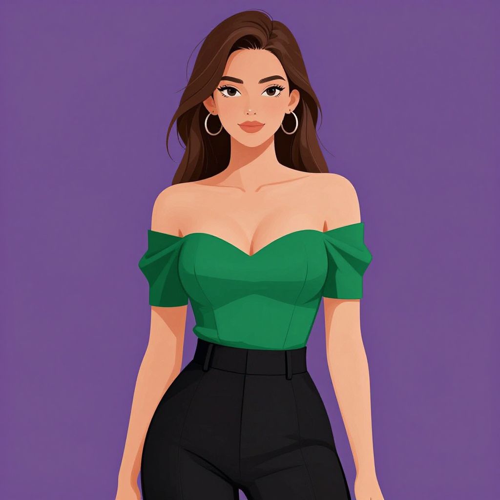 Digital illustration of a young woman with fair skin and long brown hair. She's wearing an off-the-shoulder, emerald green top that highlights her cleavage, paired with high-waisted black pants. She has hoop earrings and a subtle smile. The background is a solid purple. Her slim build and confident stance give her a stylish, elegant look. The art style is clean and vibrant.