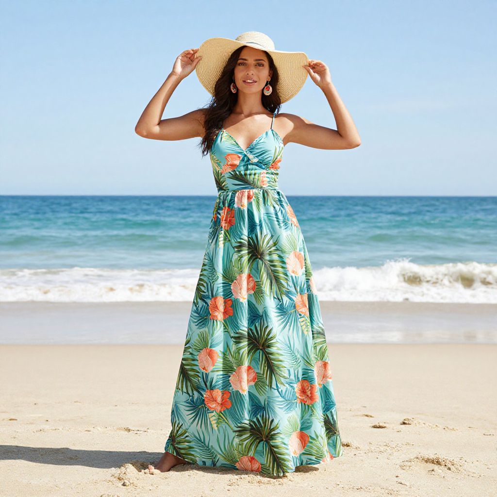 "Woman Tropical Clothes Costume, woman in a hat and dress standing on a beach"