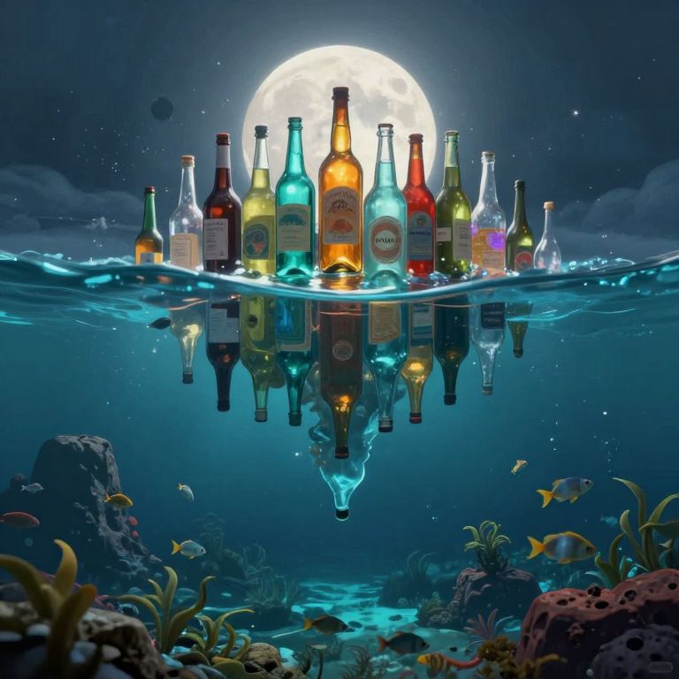 Digital illustration depicting a surreal underwater scene at night. A full moon illuminates the dark blue sky and ocean water. Numerous colorful liquor bottles, including whiskey, vodka, and beer, float in the water's surface, their reflections visible below. The bottles are surrounded by small fish and coral. The underwater scene is detailed with rocks and marine plants. The moonlight casts a bright glow on the scene, enhancing the vivid colors and creating a magical, dreamlike atmosphere.