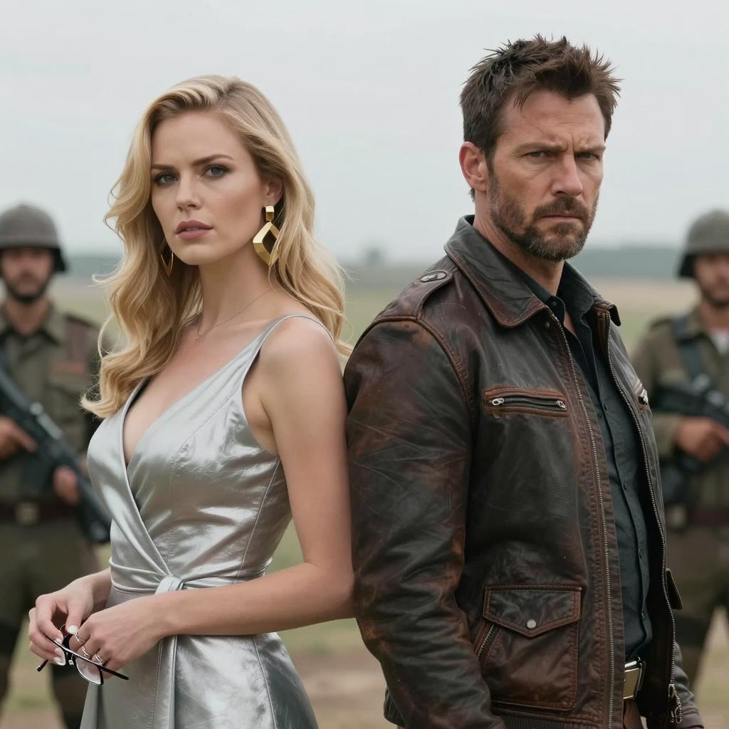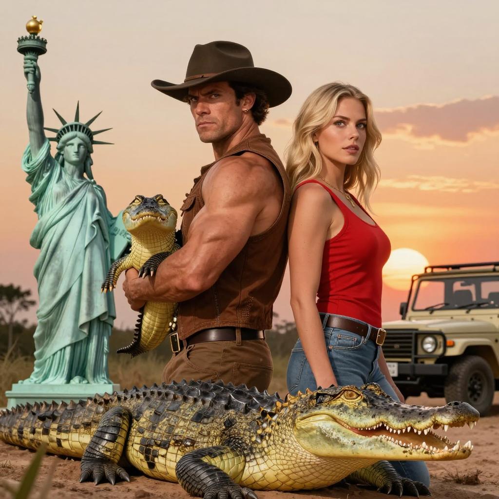 Illustration of a muscular man in a brown vest and black hat holding a crocodile, standing back-to-back with a blonde woman in a red tank top. Sunset in the background, large crocodile in the foreground, Statue of Liberty on the left, safari-style jeep on the right. Both subjects have intense expressions. Vibrant colors, realistic style.