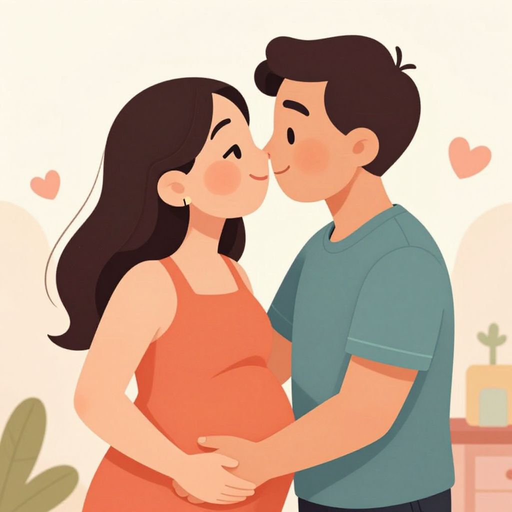 A vibrant cartoon-style illustration depicts a happy young couple expecting a baby, with the pregnant woman tenderly kissing her husband, rendered in smooth digital art with warm, inviting tones and a soft, romantic atmosphere.