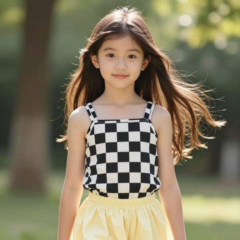 A young girl with long, flowing brown hair that cascades down her back, gently framing her face. She wears a stylish black and white checkered tank top with a playful, casual vibe, paired with a light yellow skirt that adds a bright, cheerful contrast to her outfit. She stands in a sunlit outdoor setting, with soft natural light filtering through trees, giving her a lively and natural look. Her expression is calm and smiling, exuding warmth and innocence, with a slightly relaxed posture that suggests she's at ease in her surroundings.