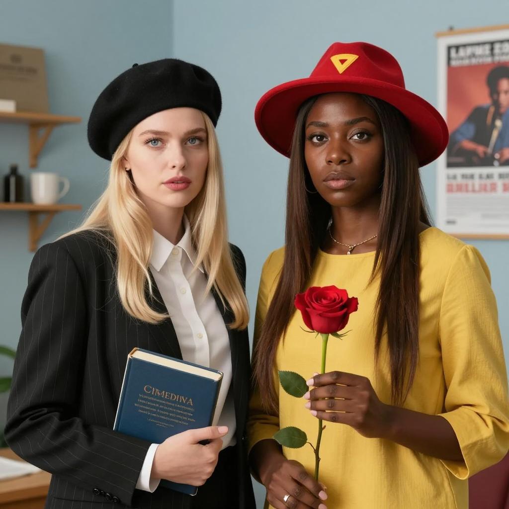 Two women, viewed from above, against a bright yellow background. The woman on the left has dark skin, short black hair, wearing a yellow and black leopard print outfit with a deep V-neck, smiling widely. The woman on the right has light skin, platinum blonde hair, wearing an orange lace top and shorts, looking to the side. Both women have high heels. The woman on the left has a black, feathered hat. The woman on the right has large, silver hoop earrings.