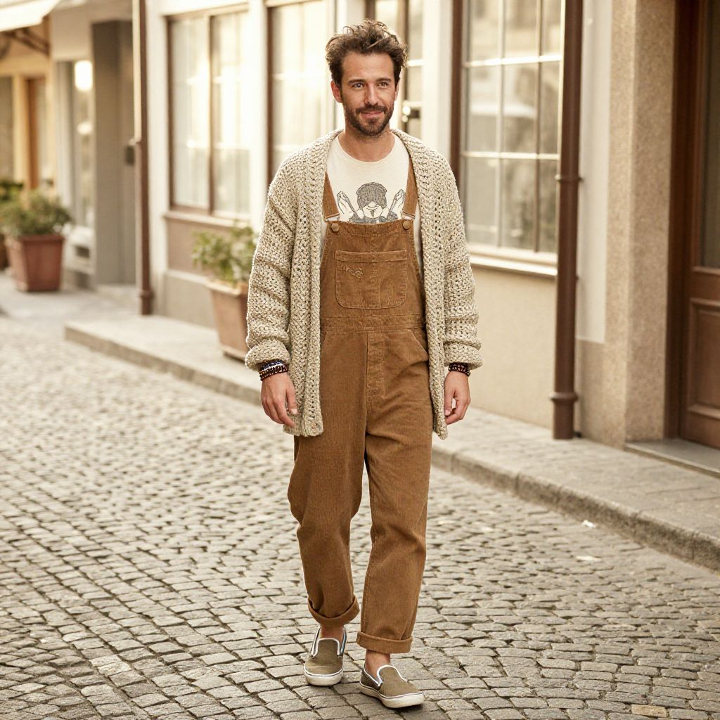 Photograph of a bearded man with medium-length brown hair, standing on a cobblestone street. He wears a white graphic t-shirt, brown corduroy overalls with a high waist, and a beige knitted cardigan. His outfit is completed with grey slip-on shoes. The background features a sunlit street with beige buildings, large windows, and a potted plant near the left. The man stands centered, looking directly at the camera with a neutral expression. The image has a slightly warm, vintage filter, adding a nostalgic feel.