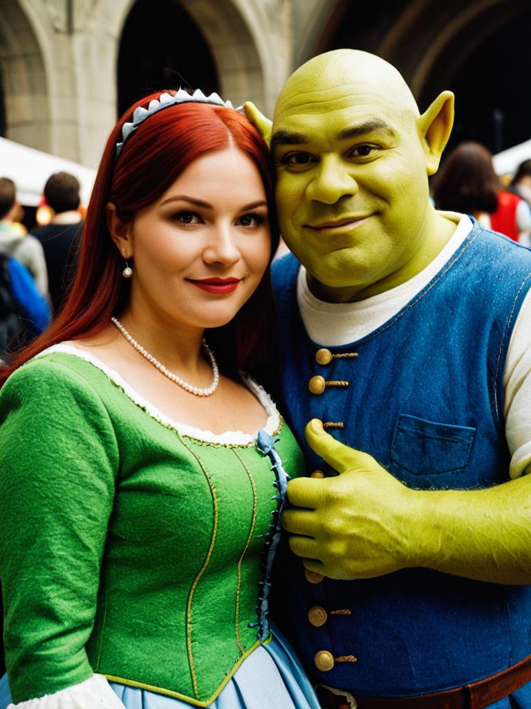 Couple in Shrek and Fiona Costume, cosplay festival portrait, photorealistic realism