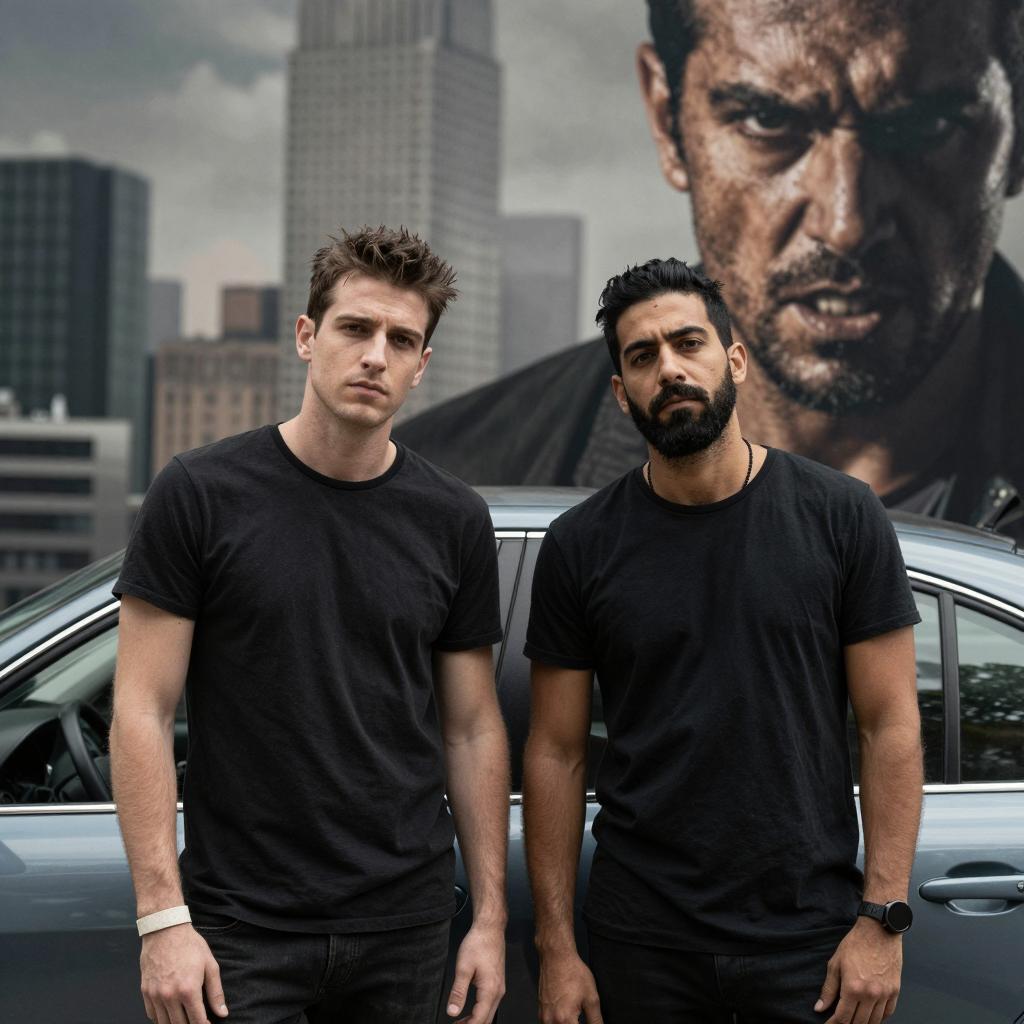 Two men standing in an alleyway at night. Left man wears a plaid shirt and white pants, holding a coiled rope. Right man in a dark jacket and blue jeans, leaning forward with a serious expression. Brick wall on left, wooden stairs on right. Sign with red and white in background.