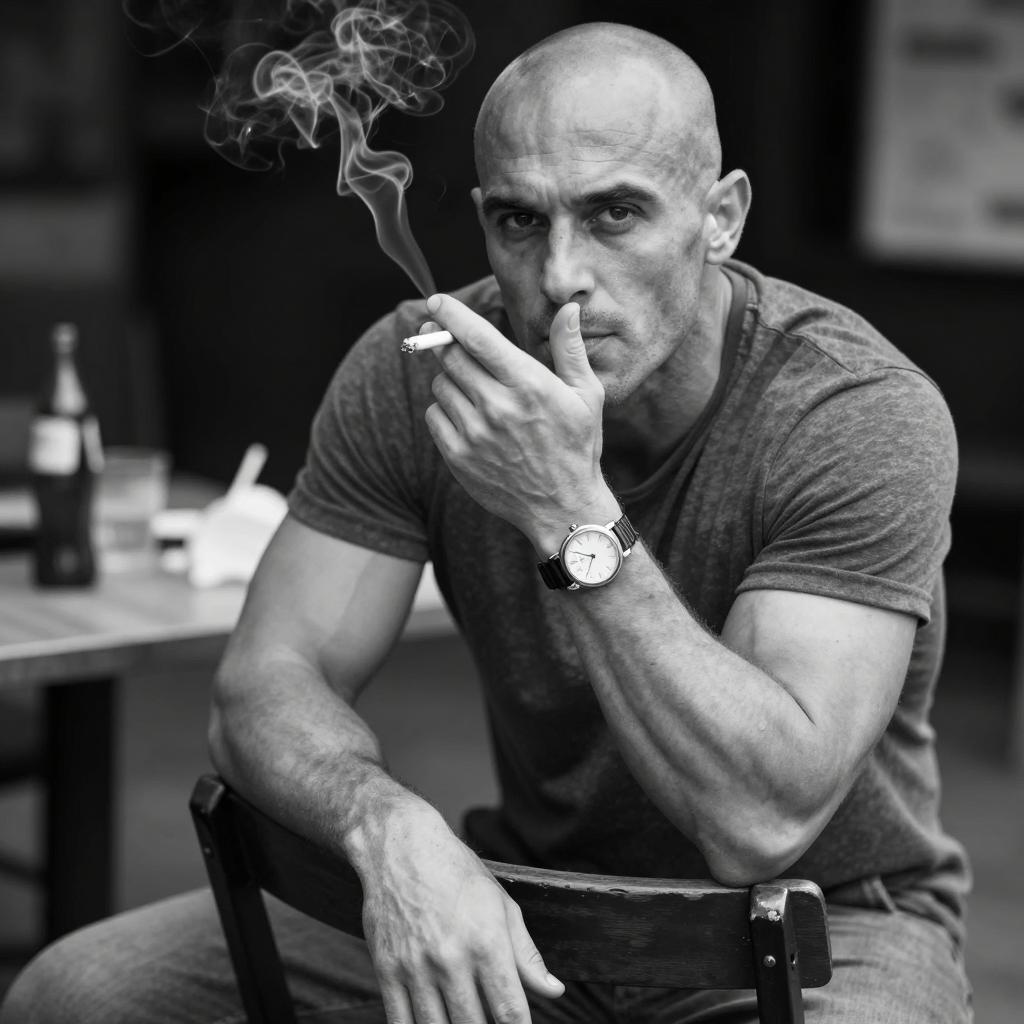 Black and white photograph of a bald, muscular man with light skin, sitting on a chair, smoking a cigarette. He wears a short-sleeved shirt, a wristwatch, and looks intensely at the camera. Background is blurred with indistinct objects. He leans slightly forward with his right arm resting on the chair's back.