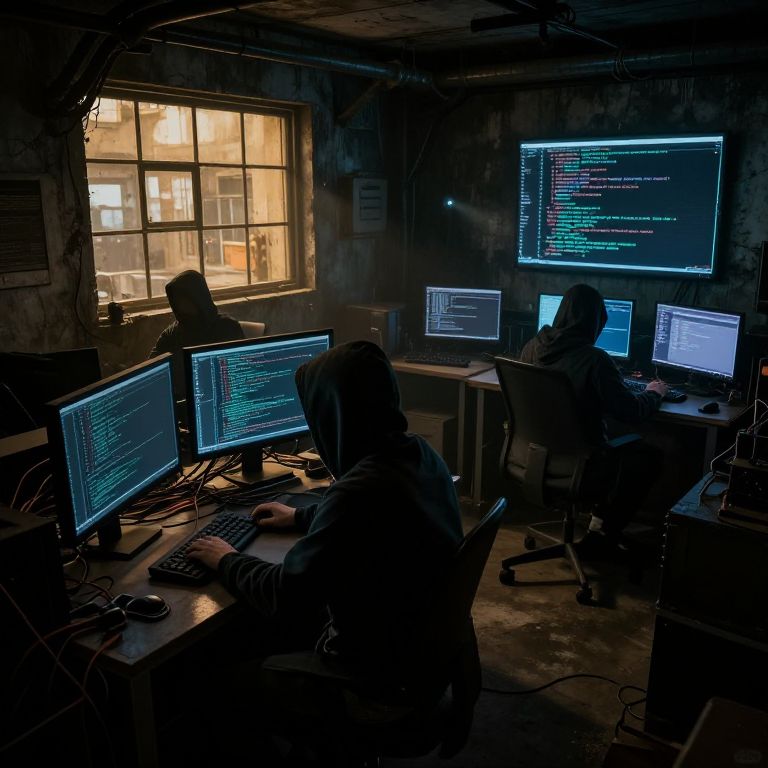Photograph of a dimly lit, industrial-style room with four individuals sitting at desks, each working on multiple computer screens displaying code in a bright blue and white terminal format. The room has a gritty, worn texture with peeling paint on the walls. A single large window on the left allows yellow-orange light to stream in, illuminating one person's profile. The individuals are silhouetted, wearing dark clothing. Monitors are positioned on desks and a wall-mounted screen to the right. The overall atmosphere is dark and focused, with a strong contrast between the illuminated screens and the shadowy room.