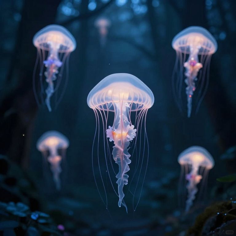 In a dreamlike realm where gravity bends and sorrow blooms, luminous jellyfish drift like celestial wanderers, their ethereal glow casting a poignant reflection on the silent, inverted forest below, where grieflight whispers secrets of transience and hope.