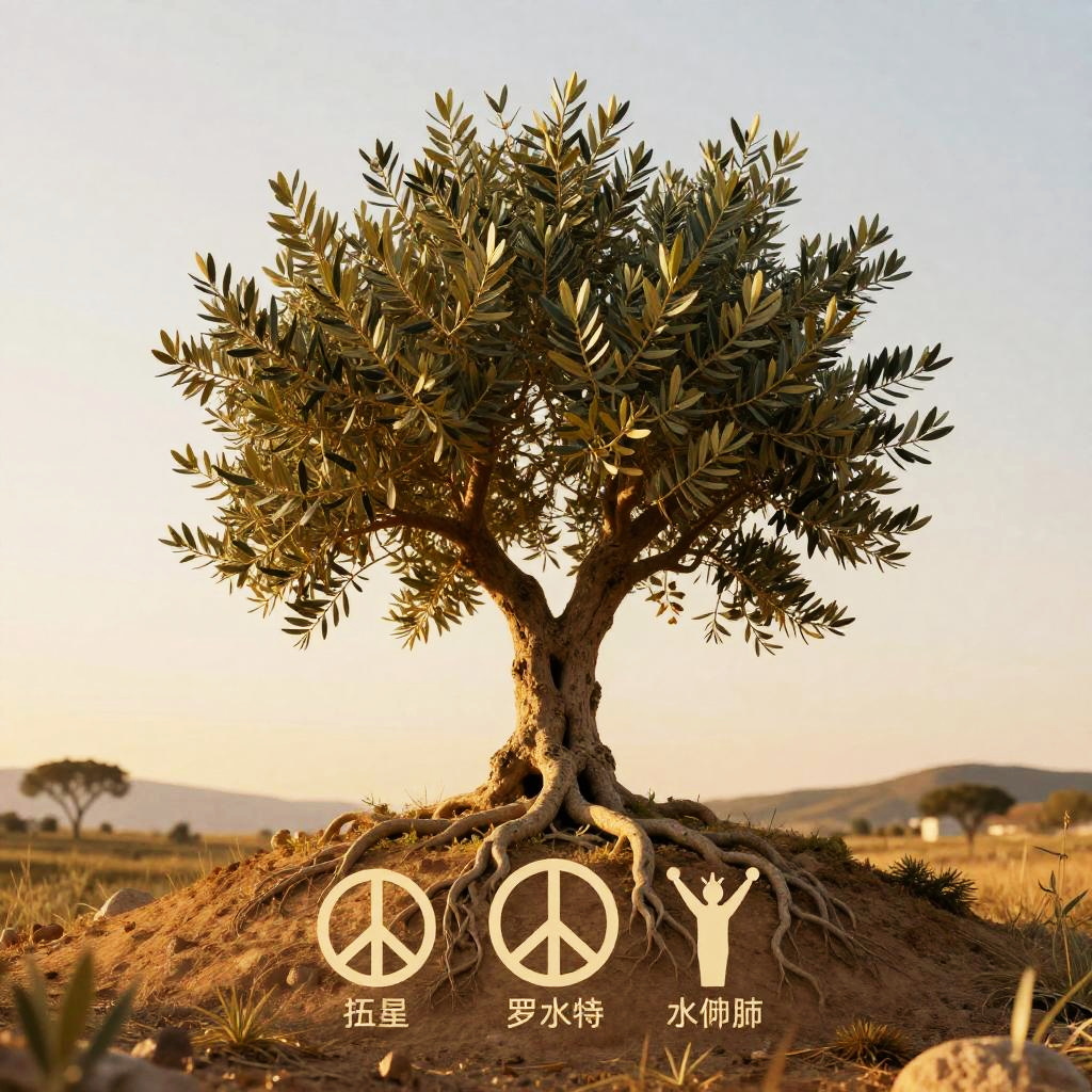 Symbolism of olive tree illustrated as an olive tree growing atop a small hill, roots intertwining with symbolic icons of peace, victory, and endurance, warm golden hour light highlighting its timeless essence.