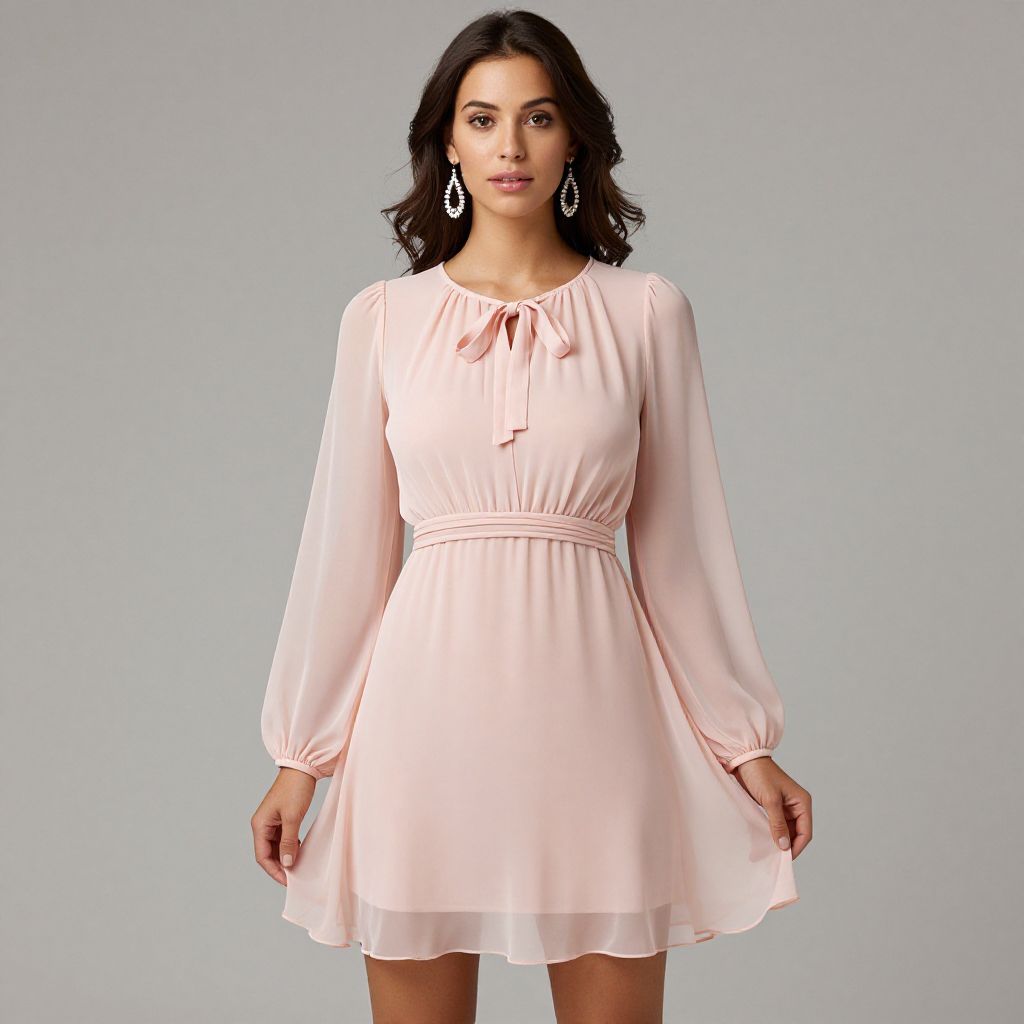 "Woman, elegance, light pink chiffon mini dress, tied neckline with bow, long sheer bishop sleeves, cinched waist, soft pleats on skirt, flowy silhouette, complemented by drop earrings.. Sexy. Pretty face and beаutiful eyes. Big breasts."