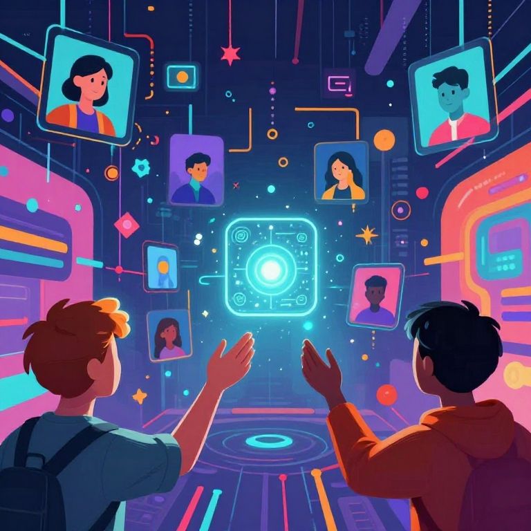 This digital illustration depicts two people, one with brown hair and a backpack, the other with dark hair, wearing orange hoodies, standing in a futuristic, neon-lit room. They are pointing at a central holographic screen displaying portraits of four individuals with varied skin tones and hairstyles. The background is filled with vibrant, glowing colors, including pink, blue, and purple, with floating icons and lines. The holographic screen is surrounded by a blue circular light, creating a sci-fi atmosphere. The image uses a bright, colorful, and highly stylized art style.