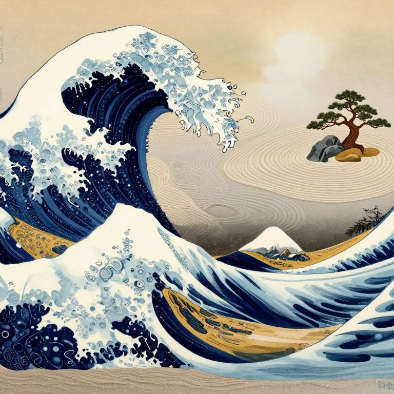 Visualize an abstract digital artwork portraying a tranquil Zen garden, reminiscent of Hokusai's \"The Great Wave off Kanagawa,\" with a surreal twist. From an aerial viewpoint, intricate patterns and textures merge modern technology and ancient aesthetics, creating a serene yet turbulent emotional gradient. The expansive, undulating wave transforms into a meticulously raked field of sand, adorned with smooth rocks and delicate bonsai trees, harmoniously blending traditional Japanese art with avant-garde digital techniques in this captivating piece that invites viewers on an enchanting journey through time and imagination.