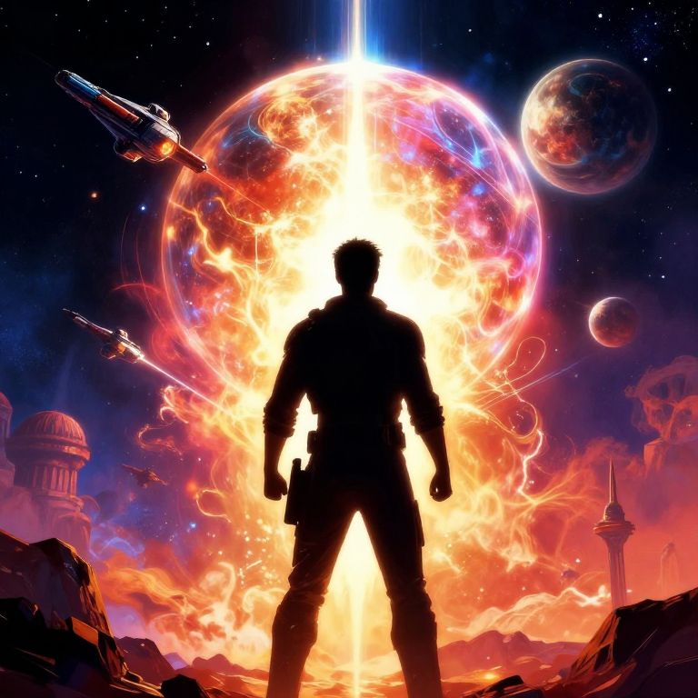 Silhouetted figure with gun standing before a fiery, colorful explosion in space, surrounded by planets, spaceships, and futuristic structures. Digital art