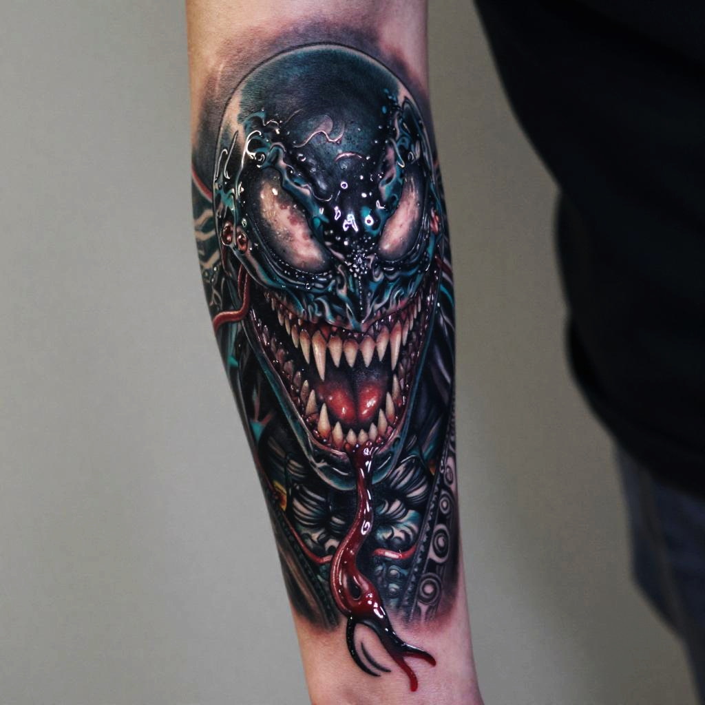 Close-up of a realistic venom tattoo sleeve featuring a snarling venom face with glowing eyes, fluid ink blending, sharp textures of skin and costume patterns. The tattoo uses dark, vibrant colors and showcases an artistic horror-themed design on the forearm.
