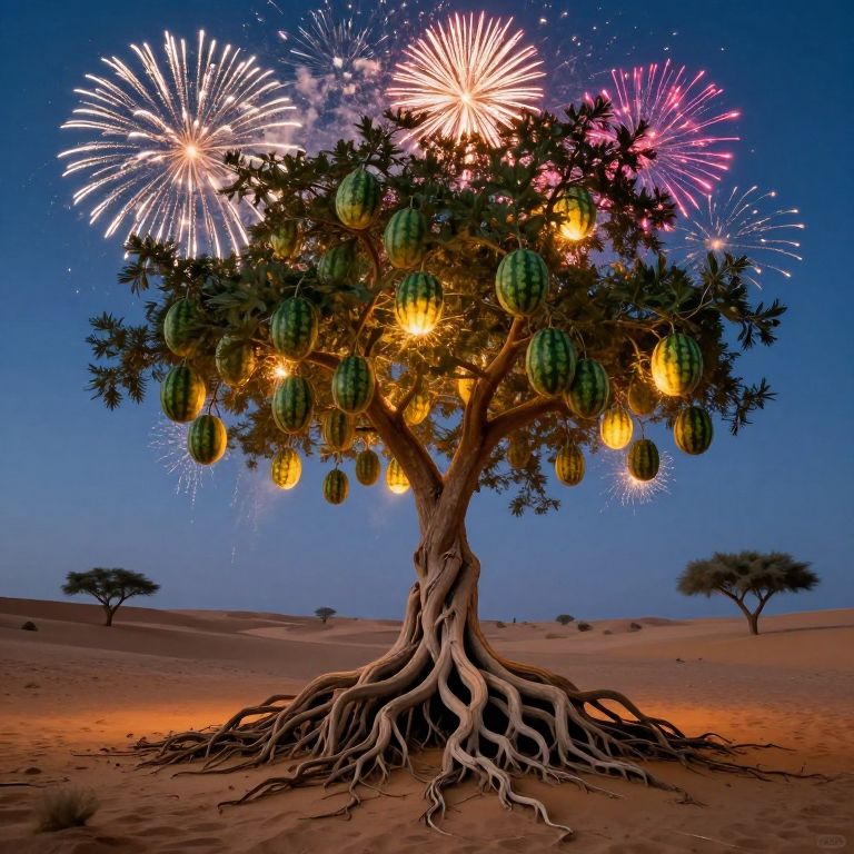 Upside-down tree rooted in a sandy desert oasis, its sprawling roots reaching skyward while its branches bear numerous watermelons that ignite into vibrant fireworks, illuminating the arid landscape beneath.