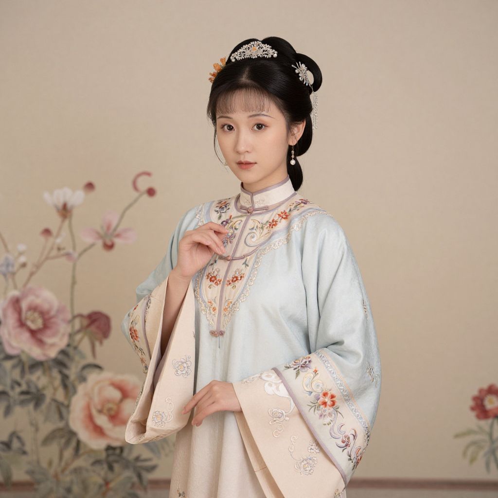 A graceful 1800s Chinese woman in a beautifully detailed pastel robe with long sleeves, adorned with intricate floral patterns and a delicate headpiece, stands amidst a serene floral backdrop.