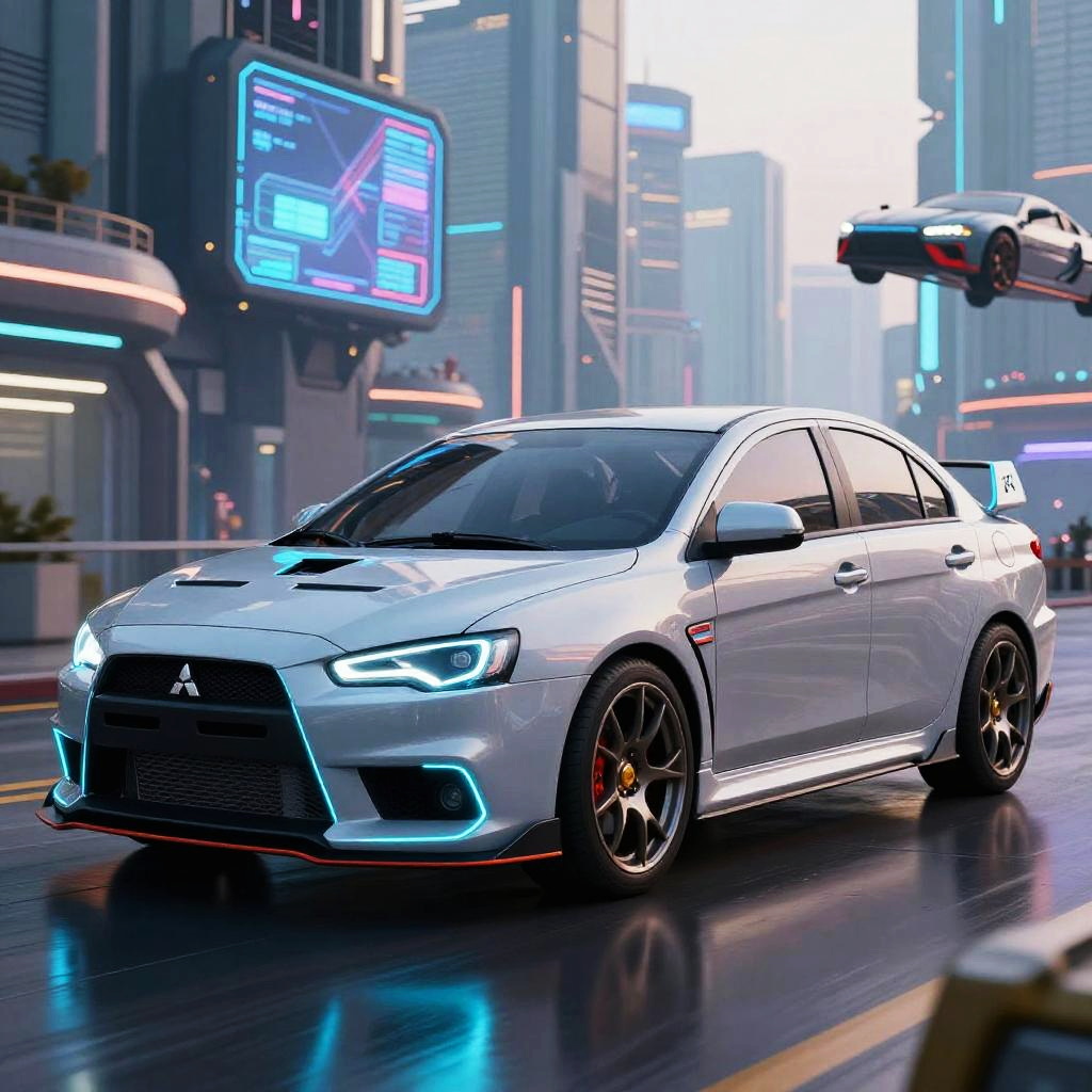 Mitsubishi Lancer Evolution 2022 concept art with futuristic modifications, glowing blue neon accents along the body, set in a sci-fi cityscape with flying cars and holographic billboards, ultra polished car surfaces reflecting neon lights, bold and innovative design