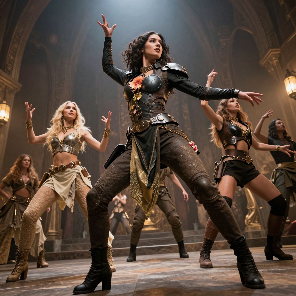 Photograph of a dynamic dance scene in a grand, dimly-lit, Gothic-style hall, featuring five women in warrior outfits with armor and flowing