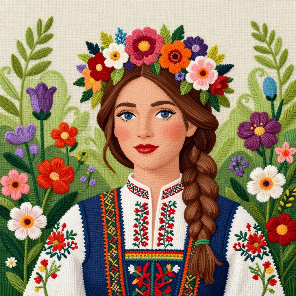 A vibrant digital illustration by Lithuanian-based embroidery artist Jūra Gric, featuring a woman adorned with a floral crown and traditional attire, set against a lush backdrop of blooming flowers and greenery, showcasing intricate details and a rich color palette characteristic of her artistic style.