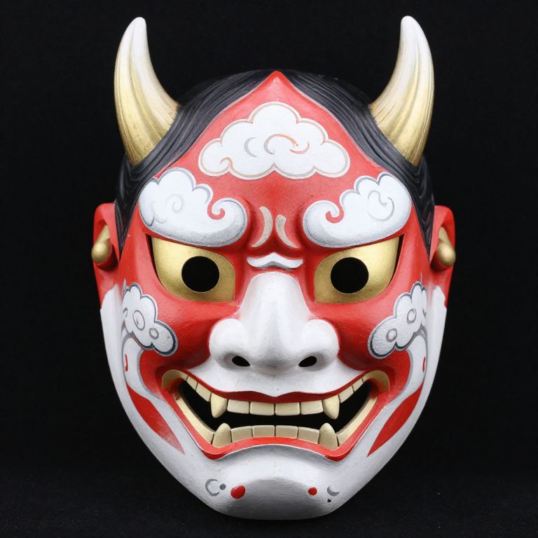 Found Object symmetrical japanese oni mask and asian clouds limited red and white palette painted asian style,