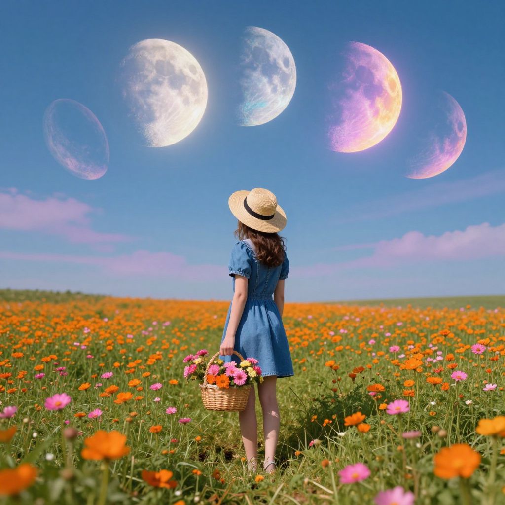 In a surreal digital artwork, a woman in a straw hat and denim dress stands amidst a vibrant field of orange and pink flowers, holding a basket of blooms as she gazes at a fantastical sky filled with multiple iridescent moons, their luminous hues creating a dreamlike, otherworldly atmosphere reminiscent of impressionistic and cyberpunk aesthetics.