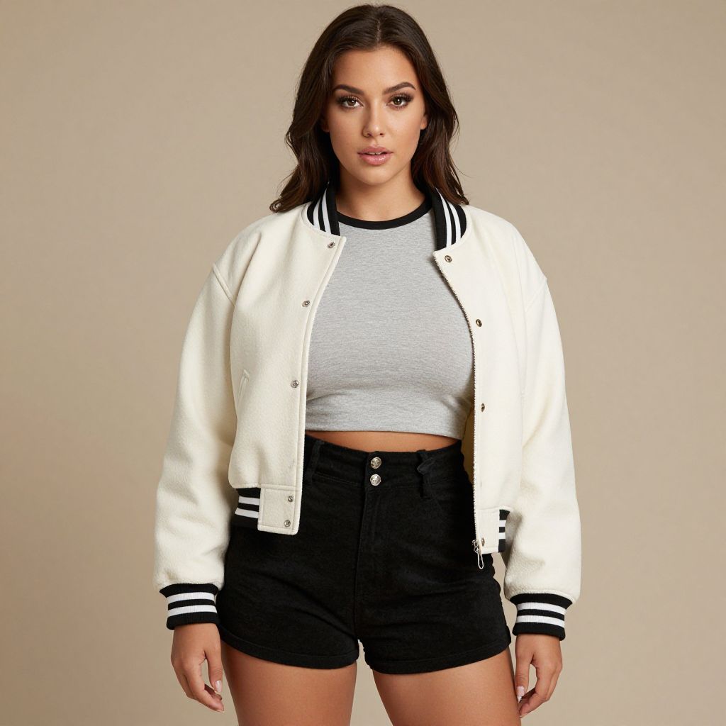 "Woman, casual sporty, varsity-style bomber jacket in cream with contrasting black and white striped detail on the collar, cuffs, and waistband, metallic snap buttons, short crop top in gray, high-waisted black velvet shorts, photo studio background. Sexy. Pretty face and beаutiful eyes. Big breasts."