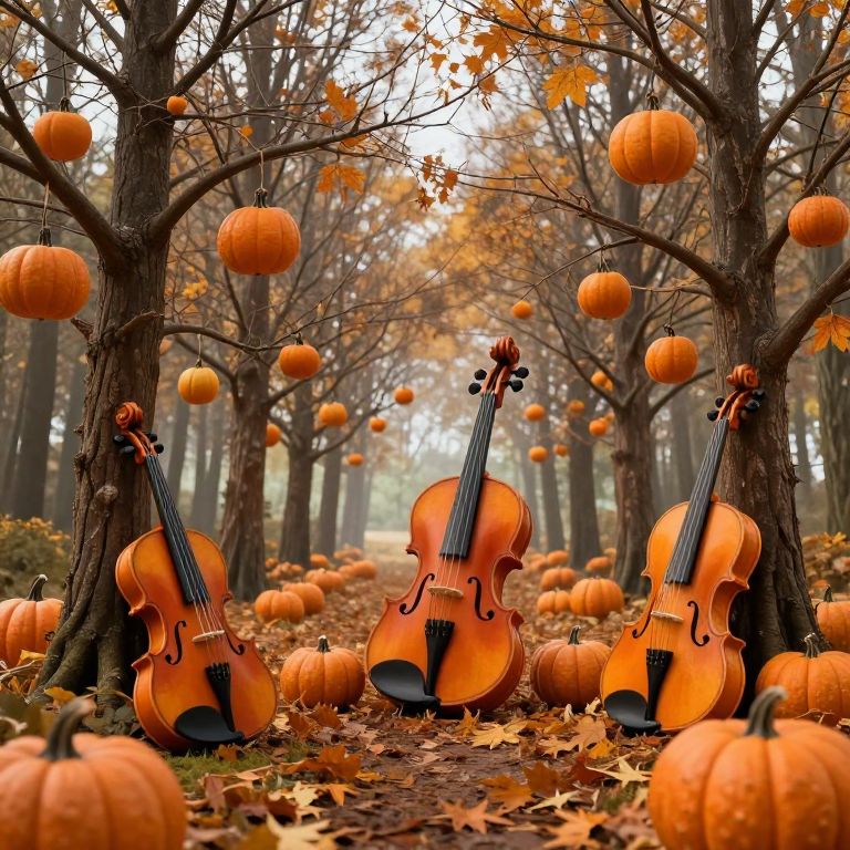 A whimsical forest where trees sprout pumpkins and cello-shaped fruits, creating a surreal landscape where music and nature intertwine.