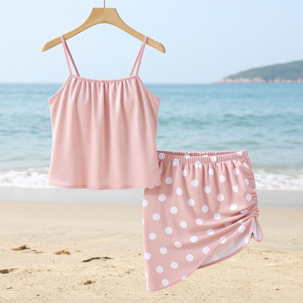 New Women Beach 2 Piece Sets Summer Spaghetti Strap Ctop Tops + Slim Skirt Dot Printed Suits Woman Sweatsuit Pink Outfit Clothes