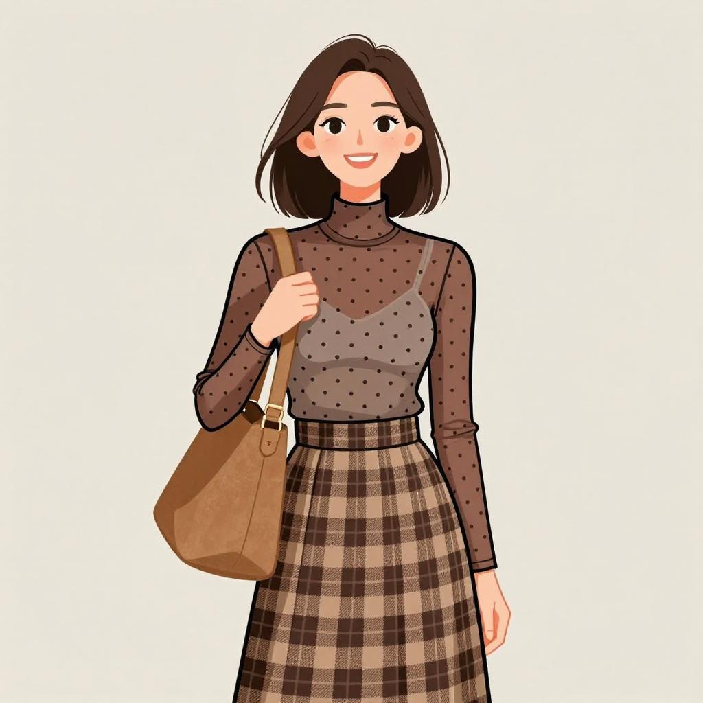 Woman with pretty face and pretty hair. smiling Woman, modern mix of textures, sheer polka-dot turtleneck in brown, long sleeves, coordinating suede shoulder bag in tan, checkered skirt in brown and tan hues, pleated design, midi length, white inner layer visible at the neck, photo studio background with a plain light backdrop. --sref 1467