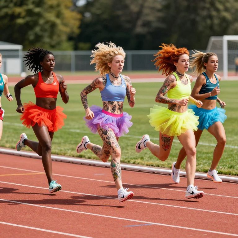 Vividly hued, tattooed runners with electrified hair and whimsical tutus sprint across a sunlit track, their synchronized strides defying the ordinary constraints of motion and style.
