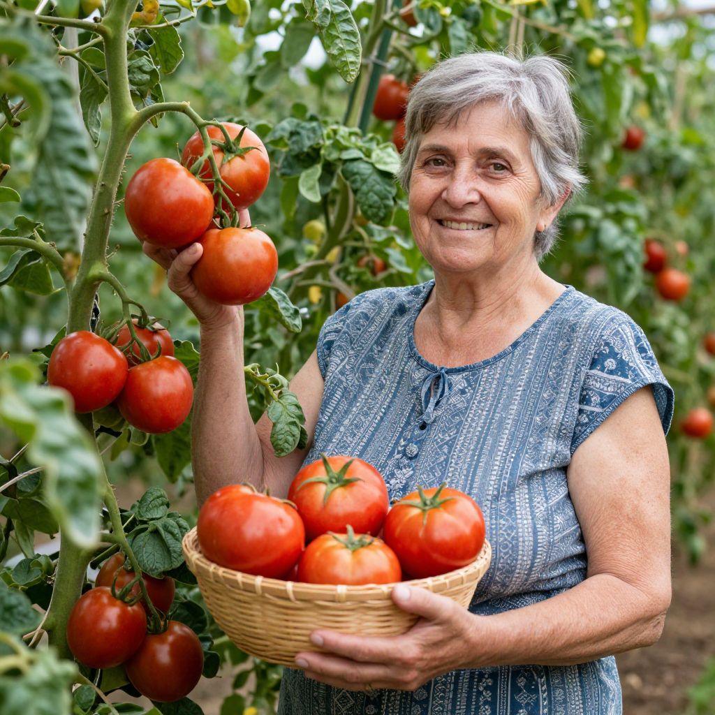 Amidst the vibrant embrace of nature, a senior woman cradles a basket of tomatoes, her smile radiating a profound sense of fulfillment and connection to the earth, while the air carries the sweet scent of growth and the promise of abundance.