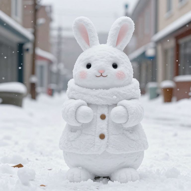 A charming 3D-rendered snow sculpture of a cute, chubby rabbit character, reminiscent of Studio Ghibli's aesthetic, sits playfully in a snowy Japanese street scene, blending whimsical cartoon design with realistic winter textures.