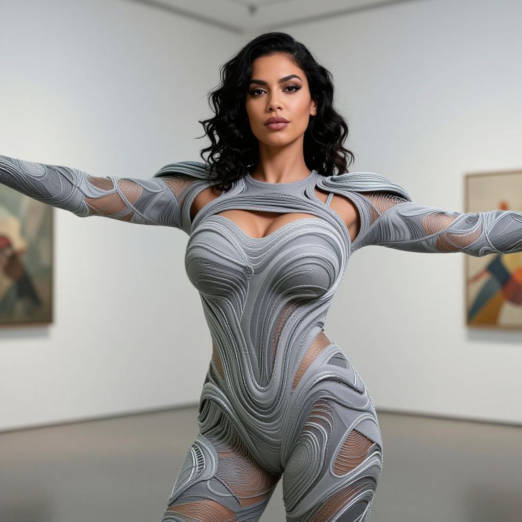Photograph of a confident woman with long, wavy black hair, wearing a form-fitting, silver, abstract-patterned bodysuit with sheer, cut-out sections revealing her skin. She stands with arms outstretched in a modern, white-walled art gallery. The bodysuit's intricate design highlights her curvy physique and large breasts. In the blurred background, two abstract paintings hang on the walls, adding color to the otherwise minimalist setting. The woman's expression is strong and assertive, and the lighting emphasizes the textures and patterns of her outfit.