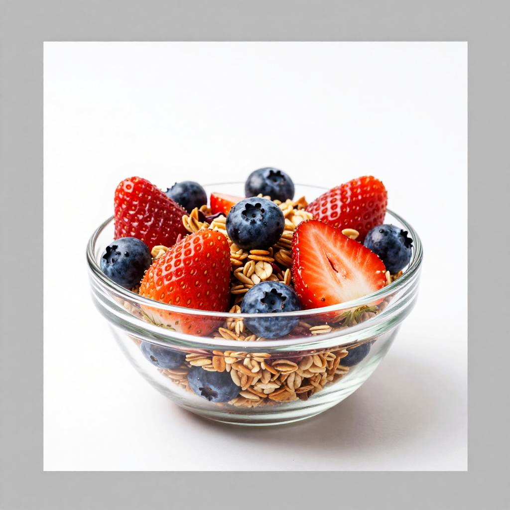 Photograph of a clear glass bowl filled with a colorful fruit and granola mix. The bowl contains bright red strawberries, dark blue blueberries, and golden granola, all mixed together. The background is a clean white, making the vibrant colors of the fruit stand out. The bowl is positioned slightly to the right, with a gray border at the top and bottom of the image.