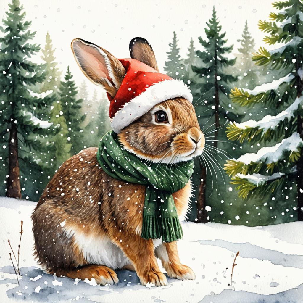 A watercolor painting of a cute brown rabbit wearing a red Santa hat and a green scarf, sitting on snow with gentle snowfall around, a blurred snowy forest background with pine trees, soft detailed textures, warm cozy holiday atmosphere, natural muted color scheme with green and red color highlights