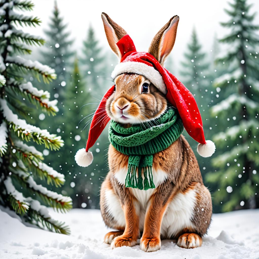 Cute Brown Rabbit in Santa Hat with Green Scarf