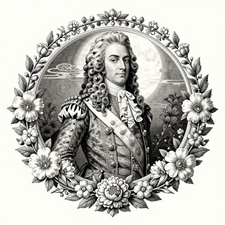 A highly detailed, Japanese-style ink illustration of Louis XVI surrounded by intricate floral designs and a moonlit background.