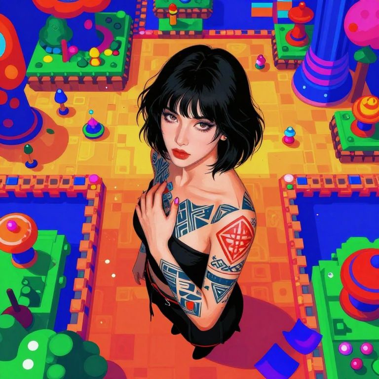 Digital art of a tattooed woman with black hair and red lipstick, standing in a colorful, geometric, toy-like maze. Vibrant, surreal style