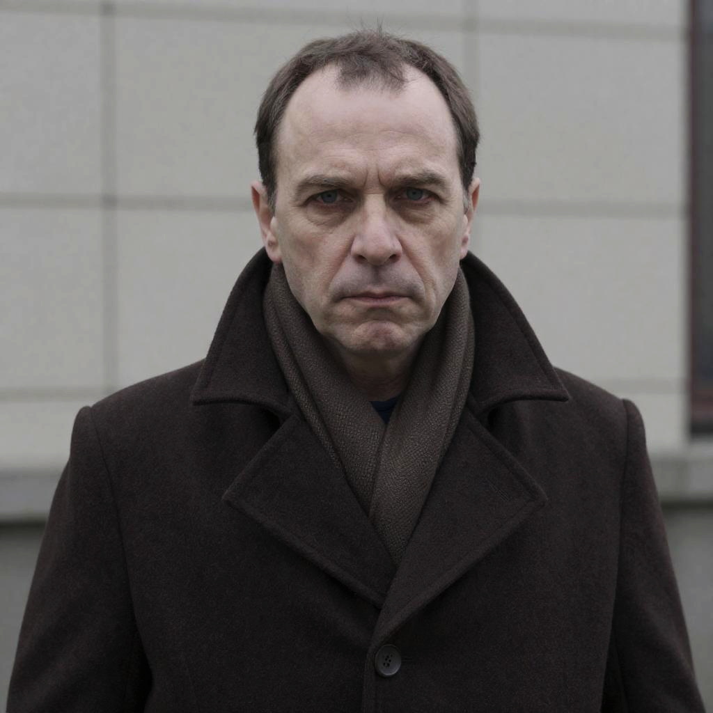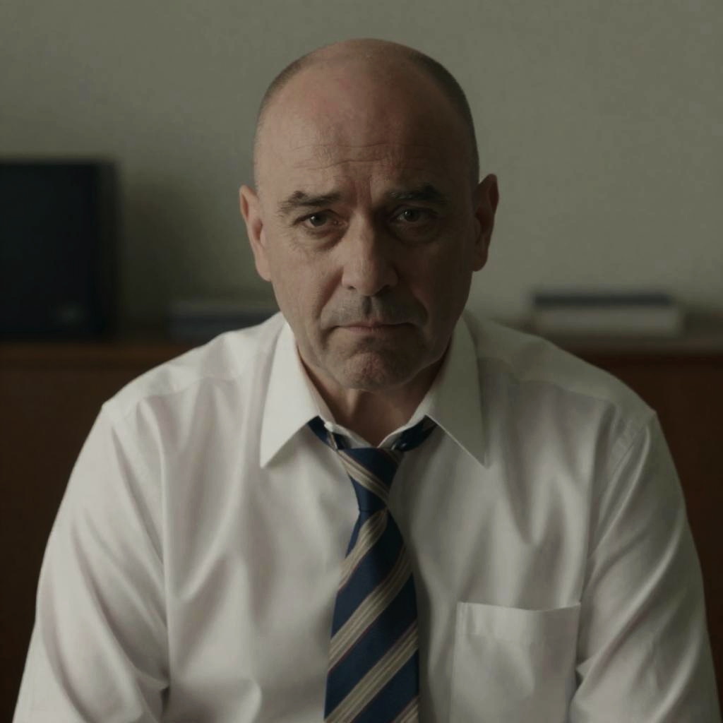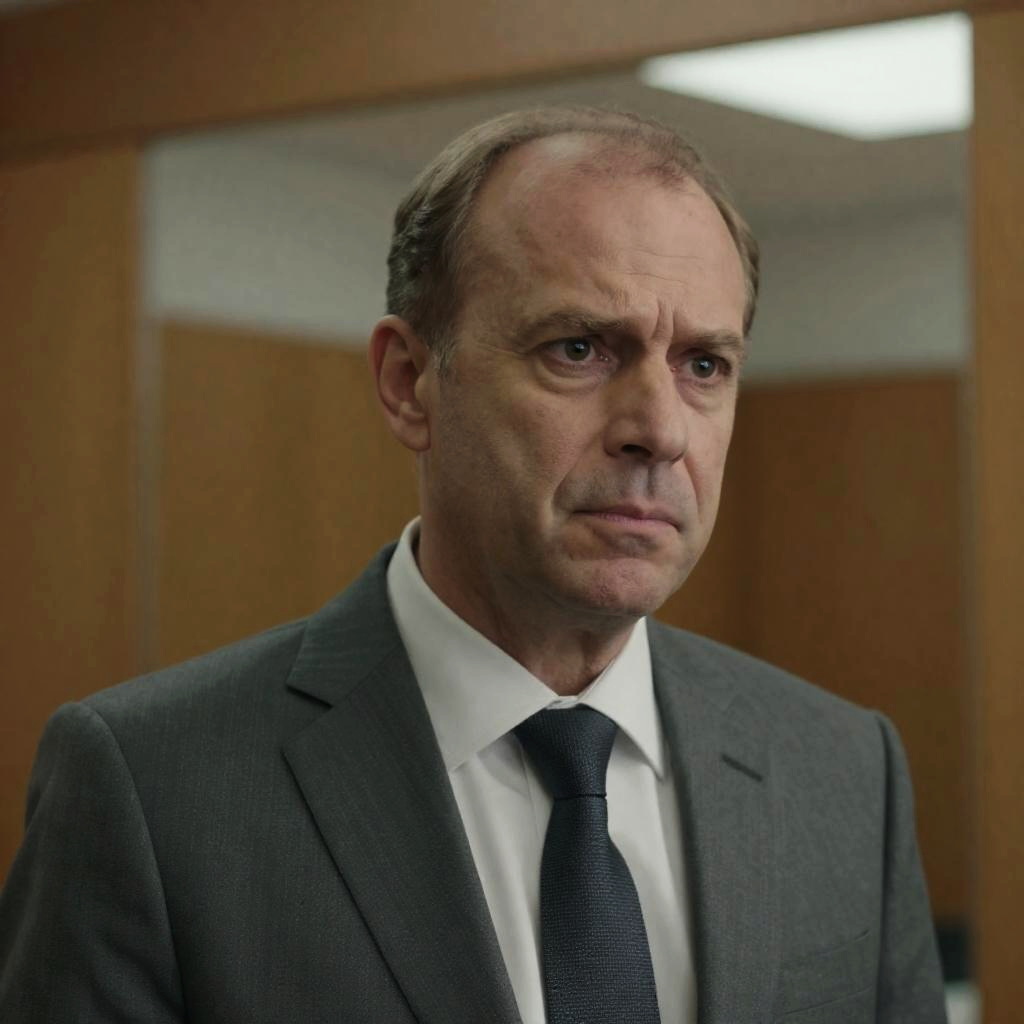Middle-aged man with receding hairline, light brown hair, wearing a grey suit, white shirt, and dark tie. Wood-paneled background with large mirror, ceiling visible. Man has slightly furrowed brow, looking to the side with mild concern. Photograph.